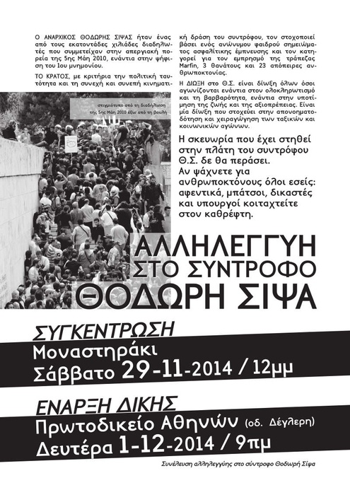 Συγκέντρωση αλληλεγγύης, εν όψει της δίκης του συντρόφου Θοδωρή Σίψα που διώκεται για τον εμπρησμό της τράπεζας marfin