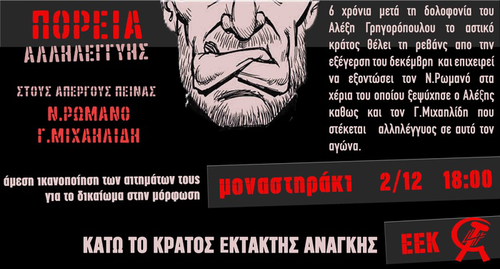 ΤΡΙΤΗ 2/1218:00 Συμμετοχή στην Πορεία Αλληλεγγύης στον Απεργό Πείνας Νίκο Ρωμανό, στο Μοναστηράκι