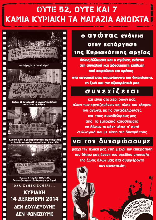 Μπροστά σε ένα ακόμα Κυριακάτικο άνοιγμα των καταστημάτων Κυριακή 14 Δεκέμβρη 2014 Αντιπαραθέτουμε μια ακόμη απεργία στον κλάδο του εμπορίου