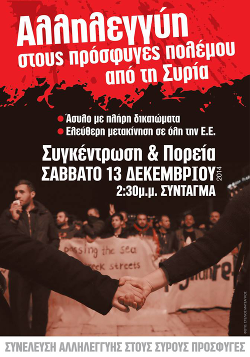 ΟΛΟΙ ΑΥΡΙΟ ΣΑΒΒΑΤΟ 13 ΔΕΚΕΜΒΡΗ ΣΤΙΣ 2.30 ΜΜ. ΣΤΟ ΣΥΝΤΑΓΜΑ ΣΤΗ ΣΥΓΚΕΝΤΡΩΣΗ ΚΑΙ ΤΗΝ ΠΟΡΕΙΑ ΑΛΛΗΛΕΓΓΥΗΣ ΣΤΟΥΣ ΣΥΡΙΟΥΣ ΠΡΟΣΦΥΓΕΣ: