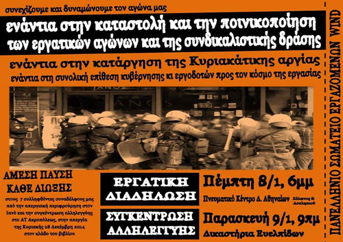 καθώς και στη συγκέντρωση αλληλεγγύης, την Παρασκευή 9/1, στις 9 π.μ., στα δικαστήρια της οδού Ευελπίδων, για τους επτά συναδέλφους που βρέθηκαν την Κυριακή 28/12/2014 αντιμέτωποι με τα κλομπ του πολιτισμού, αγωνιζόμενοι ενάντια στη κατάργηση της κυριακάτικης αργίας.