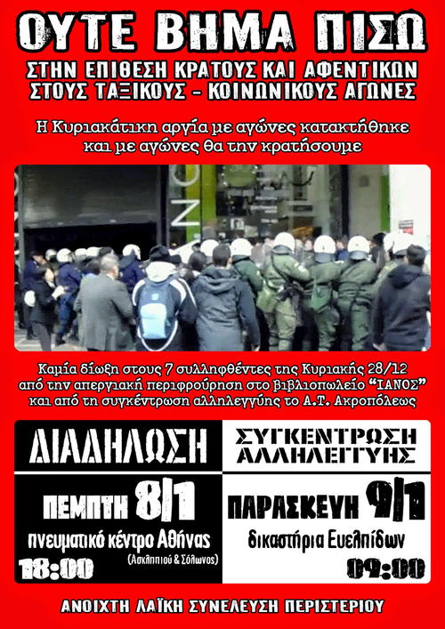 Διαδήλωση (Πέμπτη 8/1) και συγκέντρωση αλληλεγγύης (Παρασκευή 9/1) για τους συλληφθέντες της 28/12