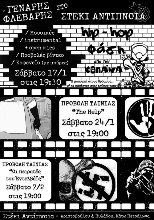 αναρχικό-αντιεξουσιαστικό στέκι Αντίπνοια Αριστοβούλου και Πυλάδου Κάτω Πετράλωνα 5' περπάτημα από ΗΣΑΠ Πετραλώνων λεωφορεία 049,815,914 - στάση ΕΛΟΥΛΟΥ