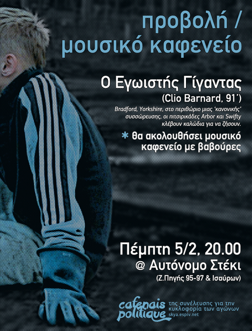 Προβολή της ταινίας «Ο εγωιστής γίγαντας» (Clio Barnard , 91′) στις 20:00. Θα ακολουθήσει μουσικό καφενείο με βαβούρες…