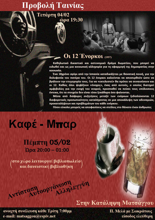 - Τετάρτη 4/2 στις 19:30 προβολή ταινίας (οι 12 ένορκοι)