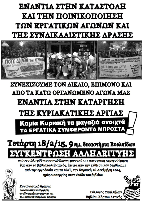 Η Κυριακή 28 Δεκέμβρη ήταν η όγδοη Κυριακή μέσα στο χρόνο και η τρίτη Κυριακή μέσα στο μήνα που κράτος και αφεντικά προσπάθησαν να επιβάλλουν το άνοιγμα των καταστημάτων. Ο Σύλλογος Υπαλλήλων Βιβλίου Χάρτου Αττικής στο πλαίσιο της υπεράσπισης της Κυριακάτικης αργίας, κήρυξε απεργία στον κλάδο του βιβλίου. Το Συντονιστικό Δράσης ενάντια στην κατάργηση της Κυριακάτικης αργίας και τα "απελευθερωμένα" ωράρια στήριξε την απεργιακή κινητοποίηση, ενισχύοντας μαζί με εργαζόμενους και αλληλέγγυους τις απεργιακές περιφρουρήσεις στα καταστήματα Ιανός και Παπασωτηρίου.