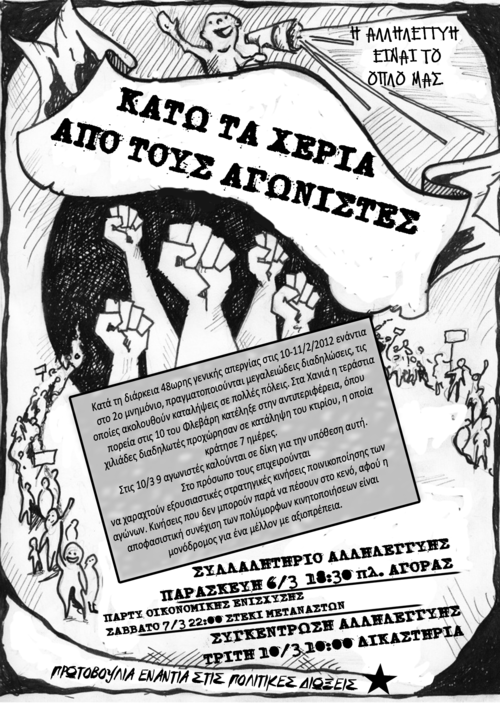 Τις πρώτες μέρες του 2015, μου κοινοποιείται κλητήριο θέσπισμα το οποίο με καλεί στις 10 Μαρτίου μαζί με άλλους 8 αγωνιστές σε δίκη για την υπόθεση της κατάληψης της αντιπεριφέρειας Χανίων, τον Φλεβάρη του 2012. Προσωπικά είναι η πρώτη μου κλήση σε δικαστήριο, ενώ διώκομαι ακόμα για άλλες δύο υποθέσεις. Για τα γεγονότα στην παρέλαση τον Οκτώβρη του 2011, όπως και για την παρέμβαση στην βιβλιοπαρουσίαση του στρατόκαυλου εθνικιστή στρατηγού Φράγκου Φραγκούλη τον Ιανουάριο του 2013. Σε αυτό το σημείο, αξίζει να τονιστεί πως εκτός από τις προαναφερθείσες υποθέσεις, στα Χανιά υπάρχουν ακόμα ανοικτές δικογραφίες και για άλλα περιστατικά, όπως συμπλοκές με φασίστες, σπασίματα πολιτικών γραφείων, την ανακατάληψη του κτιρίου Παπαδοπέτρου, τις κινητοποιήσεις των μαχόμενων κατοίκων του Αποπηγαδίου, συγκρούσεις σε πορείες κ.α.. Αυτό έχει σαν αποτέλεσμα τη δίωξη δεκάδων συνολικά ατόμων από ευρύ πολιτικό φάσμα, ενώ σύμφωνα με πρόσφατη νομοθετική διάταξη, όσοι από αυτούς δουλεύουν στον δημόσιο τομέα και εκκρεμεί εις βάρος τους Ε.Δ.Ε., τίθoνται αυτόματα και σαν πρώτοι υποψήφιοι για αργία διάρκειας ενός έτους.