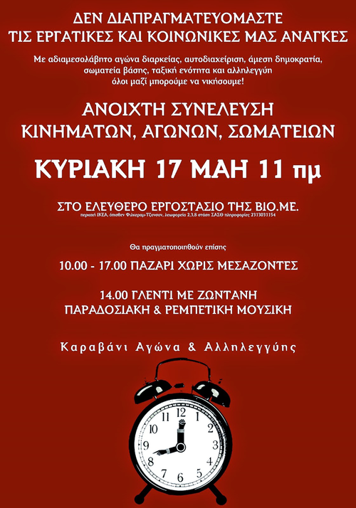 Σας καλούμε στην επόμενη μεγάλη ανοιχτή γενική συνέλευση που θα πραγματοποιηθεί στο εργοστάσιο της ΒΙΟ.ΜΕ. την Κυριακή 17 του Μάη στις…