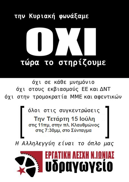 ΨΗΦΙΣΑΜΕ «ΟΧΙ» - ΜΕΝΟΥΜΕ «ΟΧΙ». Κάλεσμα Λέσχης για την συγκέντρωση της Τετάρτης 15/7, στις 7:30μμ, στο Σύνταγμα
