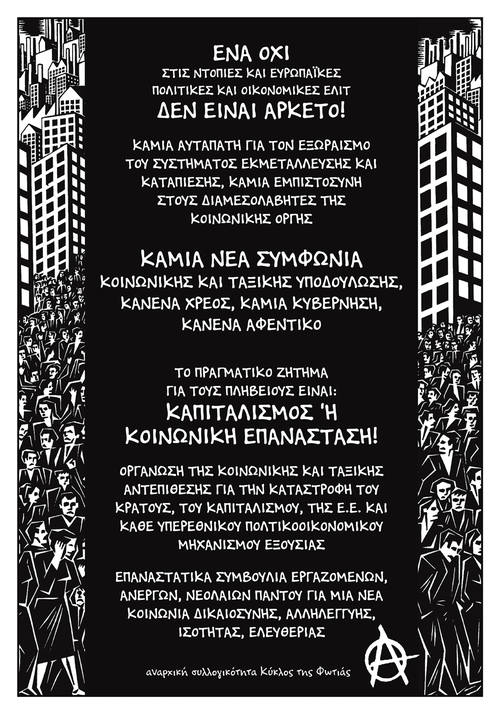 "...Από πλευράς μας, δεν πρέπει να έχουμε καμία αυταπάτη σχετικά με το ότι η κίνηση των πολιτικών διαχειριστών θέλει να εξυπηρετήσει μόνο την ύπαρξη αυτού του χρεοκοπημένου συστήματος, τη συνέχεια της εκμετάλλευσης και της καταπίεσης των από τα κάτω. Η συλλογιστική διαδικασία προς την απάντηση του διλήμματος δεν πρέπει να ξεκινά από το πολιτικό αδιέξοδο που οδηγεί στην ανάθεση και ανανεώνει τις αυταπάτες που καλλιεργήθηκαν σχετικά με το ΣΥΡΙΖΑ, ούτε από το «μη χείρον βέλτιστων». Καθώς ούτε από την έλλειψη πίστης και την παύση κατάθεσης μέσα στον αγώνα. Η προϋπόθεση για να χαράσσεται ο δρόμος προς την κοινωνική και ταξική χειραφέτηση είναι οι ακηδεμόνευτοι και διαρκείς αγώνες, η κοινωνική και ταξική αντεπίθεση ενάντια σε κράτος και κεφάλαιο