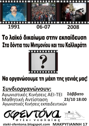Πάνω σε αυτό το έδαφος έρχονται το Μνημόνιο και ο Καλλικράτης στην εκπαίδευση. Με το νέο νόμο-πλαίσιο, την αξιολόγηση των καθηγητών, το νέο εξεταστικό, τον Καλλικράτη στα ΑΕΙ-ΤΕΙ, και τόσα άλλα που σχεδιάζονται. Αυτή τη μάχη καλούμαστε να οργανώσουμε. Μέσα από τους φοιτητικούς συλλόγους, με κοινή δράση, μέσα από τις μαθητικές συνελεύσεις και τις ΕΛΜΕ. Να ανατρέψουμε τα εφιαλτικά σχέδια τους, να πάρουμε πίσω τα δικαιώματα μας σε ΣΠΟΥΔΕΣ - ΔΟΥΛΕΙΑ-ΕΛΕΥΘΕΡΙΕΣ. Να ρίξουμε τα μέτρα τους, να σπάσουμε το τζάμι του Μνημονίου. Να γίνουμε ακόμα μια φορά στην ιστορία του λαϊκού κινήματος, πυροκροτητής της λαϊκής έκρηξης.