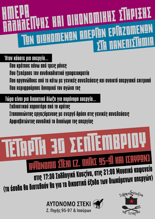 Tετάρτη 30 Σεπτέμβρη: Ημέρα αλληλεγγύης και οικονομικής στήριξης των διωκόμενων απεργών εργαζομένων στα πανεπιστήμια.