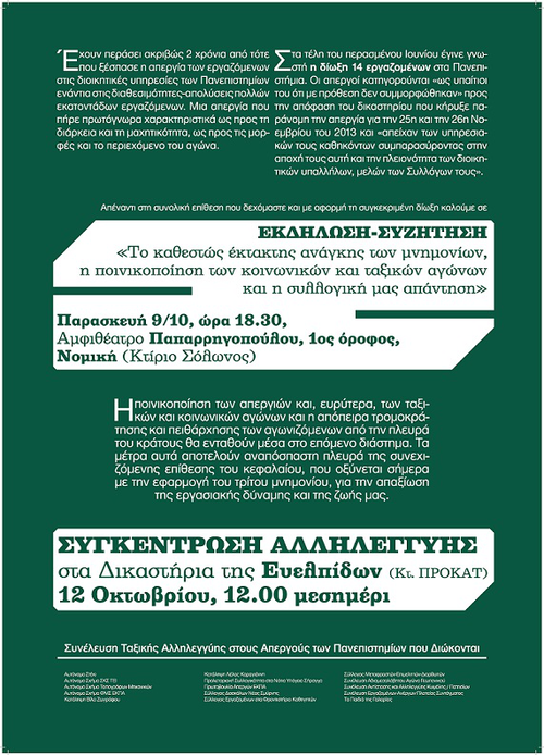 Στα τέλη του περασμένου Ιουνίου έγινε γνωστή η δίωξη 14 εργαζομένων στα Πανεπιστήμια. Οι απεργοί κατηγορούνται «ως υπαίτιοι του ότι με πρόθεση δεν συμμορφώθηκαν» προς την απόφαση του δικαστηρίου που κήρυξε παράνομη την απεργία για την 25η και την 26η Νοεμβρίου του 2013 και «απείχαν των υπηρεσιακών τους καθηκόντων συμπαρασύροντας στην αποχή τους αυτή και την πλειονότητα των διοικητικών υπαλλήλων, μελών των Συλλόγων τους».