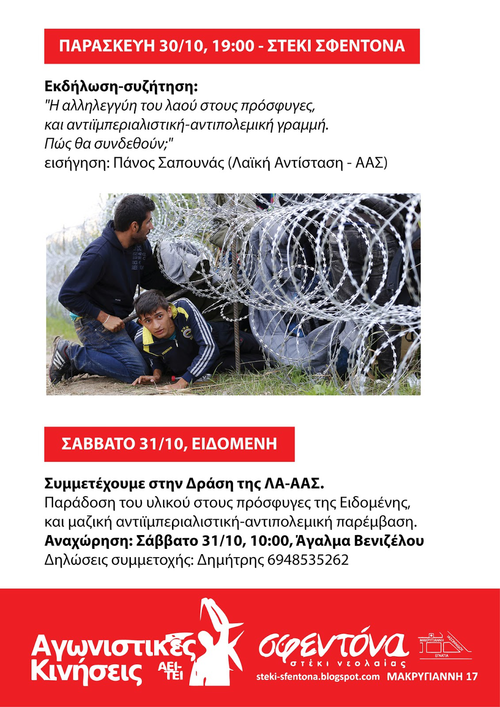 Η Λαϊκή Αντίσταση - ΑΑΣ Θεσσαλονίκης και το Στέκι Σφεντόνα, καλούν τους κατοίκους της πόλης και τη νεολαία, μαζικά να ενισχύσουν την συγκέντρωση υλικού για τους πρόσφυγες που καθημερινά συγκεντρώνονται στην Ειδομένη. Η ΛΑ-ΑΑΣ, θα βρεθεί για δεύτερη φορά το τελευταίο διάστημα στην Ειδομένη, το Σάββατο 31 Οκτώβρη, καλώντας ανοιχτά όποιον φίλο και συναγωνιστή το επιθυμεί να μεταβεί μαζί μας στην περιοχή.