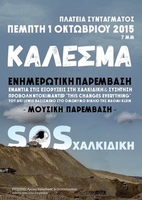 Την Πέμπτη 1 Οκτωβρίου 2015, στην πλατεία Συντάγματος από τις 7 μ.μ. θα πραγματοποιήσουμε, ενημερωτική παρέμβαση ενάντια στις εξορύξεις στη Χαλκιδική. Το πρόγραμμα περιλαμβάνει ενημερωτικές παρεμβάσεις, συζητήσεις, μουσική και προβολή του ντοκιμαντέρ του Avi Lewis "This changes everything" που βασίζεται στο ομώνυμο βιβλίο της Naomi Klein.