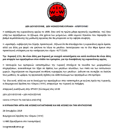 Για όλα αυτά, αλλά και για το δικαίωμα των εργαζομένων στην κατεκτημένη με αγώνες Αργία της Κυριακής, οι Βιομηχανικοί Εργάτες του Κόσμου (IWW), απεργούμε την Κυριακή 1η Νοέμβρη.