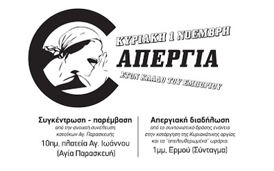 :: Κυριακή 1η Νοέμβρη :: ΑΠΕΡΓΙΑΚΗ ΔΙΑΔΗΛΩΣΗ | 13:00, ΕΡΜΟΥ (Σύνταγμα)