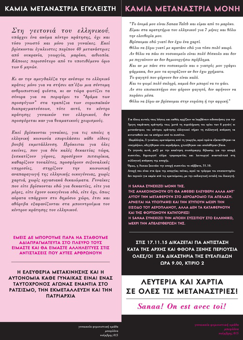 Η Sanae Taleb από το Μαρόκο, βρίσκεται φυλακισμένη εδώ και εφτά μήνες στο κέντρο κράτησης του Ελληνικού. Από τις 31 Οκτώβρη πραγματοποιεί αποχή συσσιτίου ενάντια στην τρίμηνη παράταση της κράτησής της. Κατά τη διάρκεια της έκτης μέρας αποχής από το συσσίτιο η αστυνομία την οδηγεί στο αεροδρόμιο των Σπάτων για απέλαση. Εκείνη αντιστέκεται και επιστρέφει στο Ελληνικό γεμάτη αίματα, ενώ παράλληλα τις φορτώνουν και τις κατηγορίες της αντίστασης, της απείθειας κλπ. Την Δευτέρα 9 Νοέμβρη η υπόθεσή της πήρε αναβολή. Την Τρίτη οι δεσμοφύλακες αποφάσισαν να της απαγορεύσουν τα συσκευασμένα τρόφιμα που έπαιρνε από τα επισκεπτήρια, προκειμένου να την αναγκάσουν να σταματήσει. Η Sanae Taleb δεν τρομοκρατείται και συνεχίζει τον αγώνα της απέχοντας από το συσσίτιο. Σε αυτόν τον αγώνα δεν είναι μόνη.