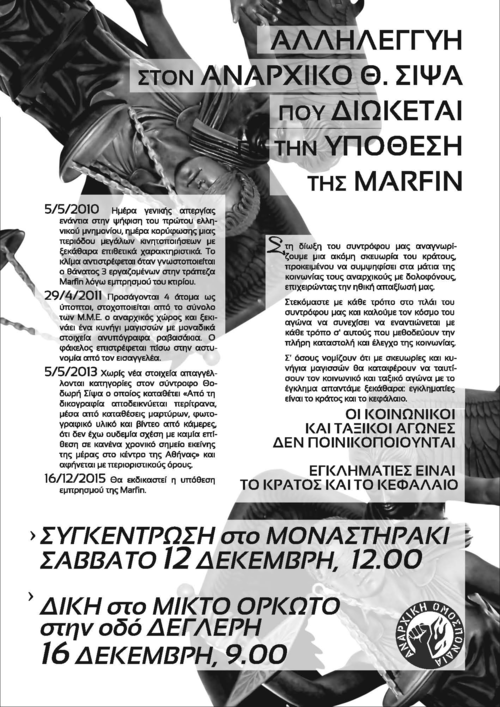 Στις 29 Απριλίου του 2011, τρεις αναρχικοί προσάγονται-απάγονται από την αστυνομία, χωρίς καμία εξήγηση. Πολύ αργότερα ενημερώνονται πως θεωρούνται ύποπτοι για την υπόθεση της Marfin και την επίθεση στο βιβλιοπωλείο «Ιανός». Η Ασφάλεια, χωρίς να έχει απολύτως κανένα στοιχείο, επικαλείται κάποιο ανώνυμο σημείωμα, άγνωστης προέλευσης, το οποίο κατονομάζει και υποδεικνύει τους συντρόφους ως εμπρηστές. Όλοι τους, από τη πρώτη στιγμή, τοποθετούνται δημόσια επί του θέματος και αρνούνται τις κατηγορίες. Στη συνέχεια, οι δύο εκ των τριών συντρόφων απαλλάσσονται των κατηγοριών και μόνο ο Θοδωρής Σίψας, πάνω στον οποίο ξεσπά όλο το εκδικητικό μίσος του κράτους για τους αγωνιζόμενους και το οποίο συμπυκνώνεται σε ένα σαθρό και γελοίο κατηγορητήριο, καλείται για να καταθέσει, ενώ ο ίδιος συνεχίζει να αρνείται όλες τις κατηγορίες που του προσάπτονται. Στις 5 Μαΐου του 2013 όμως, επετειακά και εκδικητικά, του απαγγέλονται ανυπόστατες κατηγορίες κακουργηματικού χαρακτήρα για τον εμπρησμό της τράπεζας «Marfin», ενώ του επιβάλλονται και περιοριστικοί όροι, μεταξύ των οποίων και η απαγόρευση της συμμετοχής του σε οποιαδήποτε πορεία ή διαδήλωση. Το κράτος δεν ψάχνει για στοιχεία και ενόχους, τους κατασκευάζει στήνοντας πολιτικές σκευωρίες και τους επιδεικνύει ως τρόπαια. Τελικά, ο σύντροφος παραπέμπεται σε δίκη στις 9 Δεκεμβρίου του 2013 με μοναδικά «στοιχεία» τη συμμετοχή του στην απεργιακή κινητοποίηση της 5ης Μάη του 2010 και την πολιτική του ταυτότητα. Μετά από αλλεπάλληλες αναβολές το δικαστήριο του συντρόφου Θ. Σίψα έχει οριστεί για τις 16 Δεκεμβρίου του 2015.