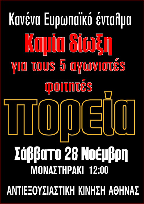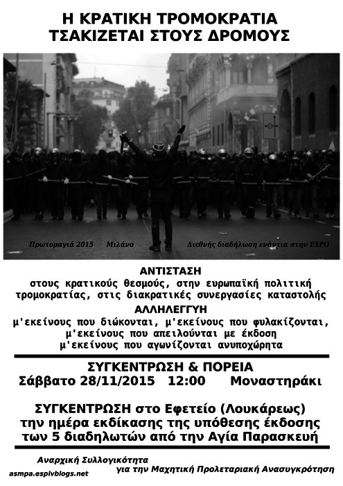 Η Περιφέρεια Αθήνας της Αναρχικής Ομοσπονδίας καλεί στην πορεία αλληλεγγύης στους συλληφθέντες του No Expo, στα πλαίσια της πανευρωπαϊκής ημέρας αλληλεγγύης στις 28/11, 12 μ.μ. στο Μοναστηράκι συμμετέχοντας στο μπλοκ της συνέλευσης αλληλεγγύης στους 5 αγωνιστές φοιτητές.