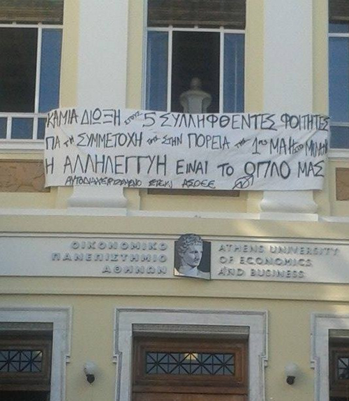Σήμερα Παρασκευή 20/11 καταλάβαμε την πρυτανεία της ΑΣΟΕΕ για να απαιτήσουμε την παύση κάθε δίωξης στους 5 φοιτητές αγωνιστές που κατηγορούνται για την συμμετοχή τους στην πορεία ΝΟ ΕΧΡΟ την 1η Μάη στο Μιλάνο.
