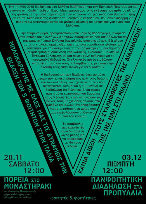 Τις τελευταίες μέρες βιώνουμε ένα πρωτοφανές γεγονός διακρατικής καταστολής και σχιζοφρένειας, που αφορά όλους τους αγωνιζόμενους φοιτητές/τριες, και που χτυπά άμεσα στη δράση και στην ύπαρξή μας. Αλλά ας πάρουμε τα πράγματα από την αρχή: Στις 2/5/15 προσήχθησαν από μια καφετέρια στο Μιλάνο 5 έλληνες φοιτητές , εκ των οποίων ο ένας απ'το φυσικό, μια μέρα μετά τη συμμετοχή τους στη μαζική διαδήλωση ΝΟ ΕΧΡΟ με μοναδική αιτιολογία ότι εθεάθησαν να βγαίνουν από κατάληψη. Αφού υποχρεώθηκαν σε βίαιη λήψη γενετικού υλικού και δακτυλικών αποτυπωμάτων, αφέθηκαν ελεύθεροι χωρίς να τους αποδοθούν κατηγορίες. 6 μήνες μετά, οι ιταλικές αρχές εκδίδουν ευρωπαϊκό ένταλμα σύλληψης (και ) γι'αυτούς και χωρίς καν να έχει παρουσιαστεί η σχετική δικογραφία στις ελληνικές αρχές, με μια γενικόλογη περίληψη κατηγορητηρίου ότι συμμετείχαν σε διαδήλωση, ζητούν να εκδοθούν και να δικαστούν στην Ιταλία. 'Ετσι, τα ξημερώματα της Πέμπτης 12/11, η ελληνική αστυνομία εισέβαλε στα σπίτια τους και αφού ξεσκόνισε κάθε γωνιά του προσωπικού τους χώρου, τους συνέλαβε και τους οδήγησε στη ΓΑΔΑ. Την παρασκευή 13/11 το πρωί, οι 5 πέρασαν από εισαγγελέα και κρίθηκαν μη προφυλακιστέοι με περιοριστικούς όρους έως ότου πραγματοποιηθεί το συμβούλιο εφετών που θα κρίνει εάν τελικά θα τους εκδώσει στην Ιταλία για να δικαστούν.