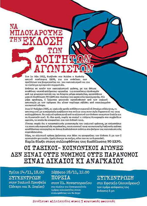 Στις 12/11, ανήμερα της πανεργατικής απεργίας, συνελήφθησαν, μετά από εισβολή στα σπίτια τους στην Αγία Παρασκευή, 5 φοιτητές - 5 αγωνιστές στο φοιτητικό κίνημα, στις συνελεύσεις γειτονιών και στις εργατικές/ταξικές διεκδικήσεις - αφού έχει εκδοθεί από τις ιταλικές δικαστικές αρχές Ευρωπαϊκό Ένταλμα Σύλληψης που απαιτεί την έκδοσή τους στο ιταλικό κράτος. Η απαίτησή τους στηρίζεται σε αβάσιμους και ανυπόστατους ισχυρισμούς ότι οι φοιτητές πήραν μέρος σε επεισόδια κατά τη διάρκεια αντικαπιταλιστικής διαδήλωσης που διοργανώθηκε στο Μιλάνο, με αφορμή την διεθνή έκθεση Expo. Το περιεχόμενο της δικογραφίας δεν έχει γίνει ακόμα γνωστό στο συμβούλιο εφετών που θα πάρει την απόφαση για την έκδοσή τους.