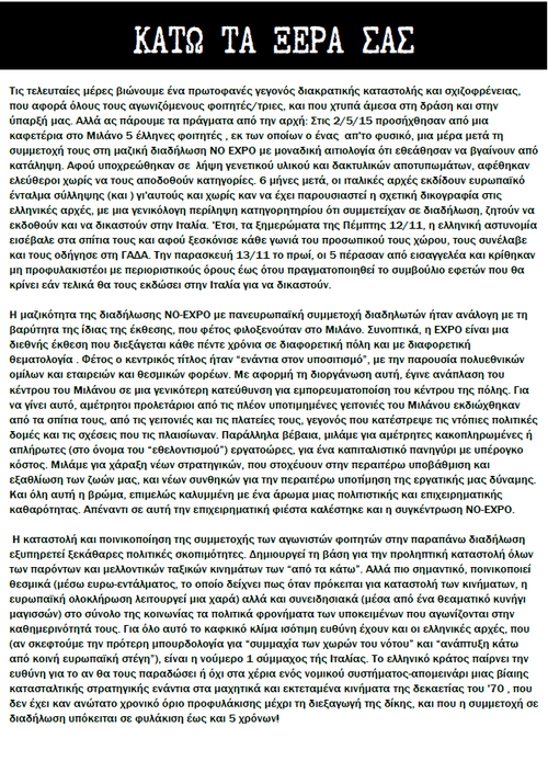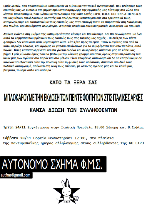 Εμείς λοιπόν, που προσπαθούμε καθημερινά να οξύνουμε τον ταξικό ανταγωνισμό, που βλέπουμε τους εαυτούς μας ως εμπόδιο στο μηχανισμό (ανα)παραγωγής της εργατικής μας δύναμης στο χώρο που λέγεται πανεπιστήμιο, που βλέπουμε τα πλοκάμια της κάθε λογής EXPO, TED-X, RETHINK ATHENS κ.α. να μας θέλουν εθελόδουλους φοιτητές και απλήρωτους μεταπτυχιακούς στα ερευνητικά τους, αναγνωρίζουμε και ταυτοποιούμε τους εαυτούς μας στην επιλογή των 5 να παραστούν στη διαδήλωση στο Μιλάνο, και στεκόμαστε αλληλέγγυοι σ'αυτούς υλικά και συναισθηματικά, συλλογικά και ατομικά.