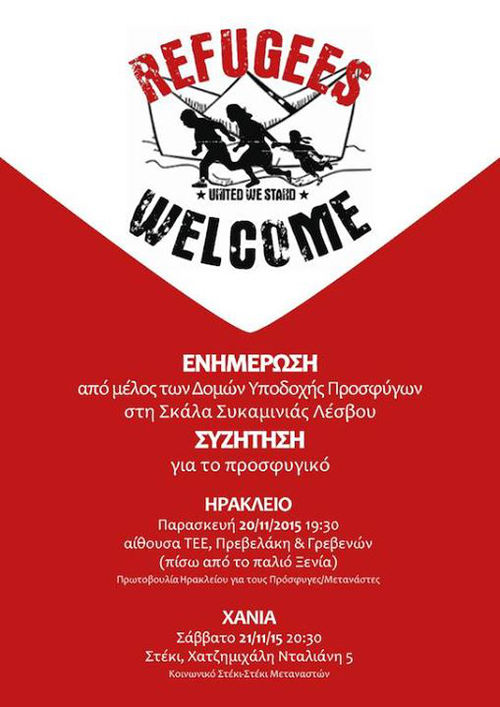 Σας περιμένουμε λοιπόν, στην εκδήλωση-συζήτηση που θα διεξαχθεί το Σάββατο 21 Νοεμβρίου στις 20.30 στο Κοινωνικό στέκι-Στέκι Μεταναστών (Χατζ. Νταλιάνη 5), οπού και θα δεχόμαστε είδη πρώτης ανάγκης από την κάτωθι λίστα: