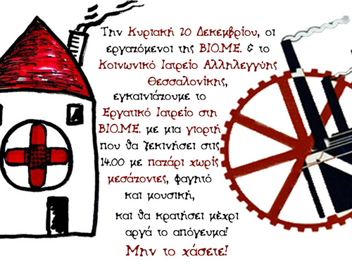 Η διεκδίκηση του δικαιώματος αυτού, η αναγνώριση ότι η υγεία είναι υπόθεση που αφορά τον κάθε άνθρωπο ξεχωριστά αλλά και ολόκληρη την κοινωνία και η εμπειρία μας στην αυτοδιαχείριση και τη συνεργασία, είναι οι λόγοι που μαζί με τους εργαζόμενους της ΒΙΟ.ΜΕ. σας καλούμε όλους (υγειονομικούς και πολίτες) να συμμετέχετε στη δημιουργία και λειτουργία ενός εργατικού ιατρείου μέσα στο εργοστάσιο της ΒΙΟΜΕ το οποίο θα παρέχει πρωτοβάθμια φροντίδα υγείας στους εργαζόμενους, στους άνεργους και στους κατοίκους της περιοχής του Πατριαρχικού Πυλαίας.