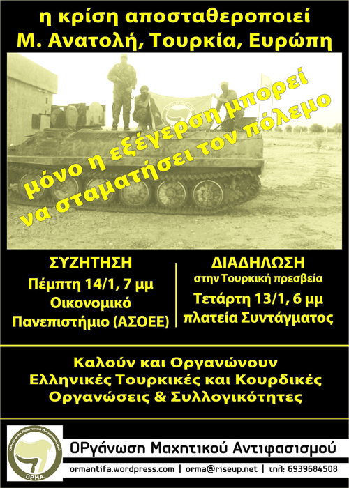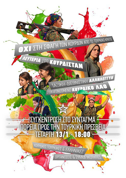 Συγκέντρωση στο Σύνταγμα και πορεία προς την τούρκικη πρεσβεία την Τετάρτη 13/1, 6μ.μ. Καλείται από κουρδικές, τουρκικές και ελληνικές αριστερές οργανώσεις και πολιτικές συλλογικότητες.