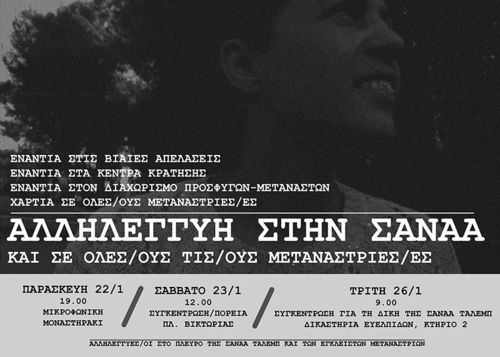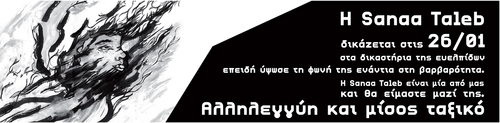Στις 26 Ιανουαρίου η Sanaa Taleb, που βρίσκεται φυλακισμένη στο κέντρο κράτησης γυναικών μεταναστριών και προσφύγων στο Ελληνικό, δικάζεται για απείθεια και φθορά δημόσιας περιουσίας. Οι κατηγορίες αυτές είναι η εκδικητική απάντηση που της δόθηκε από το κράτος και τους μηχανισμούς του γιατί αντιστάθηκε στη βίαιη απέλασή της - τη στιγμή μάλιστα που το αίτημά της για άσυλο δεν έχει ακόμα εξεταστεί-. Με τη δίωξή της οι κυρίαρχοι επιχειρούν να τρομοκρατήσουν όλους όσους αγωνίζονται και να βάλουν φρένο σε μελλοντικούς αγώνες. Από την πλευρά μας, ως αναρχικοί/ες, ως καταπιεσμένοι και εκμεταλλευόμενοι, πρέπει να σταθούμε στο πλάι των προσφύγων και των μεταναστών/στριών δείχνοντας την έμπρακτη αλληλεγγύη μας. Στηρίζοντας τους αγώνες και τις διεκδικήσεις τους, αντιλαμβανόμενοι πως ο εχθρός είναι κοινός και δεν είναι άλλος από το κράτος και τον καπιταλισμό.