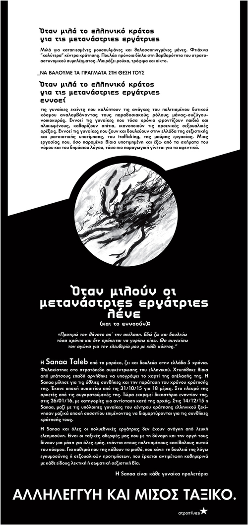 Εδώ όπου πίσω από την υποτιθέμενη κρατική ανικανότητα ξεδιπλώνεται άρτια η στρατηγική παρανομοποίησης των μεταναστριών που τις καθιστά φθηνό εργατικό δυναμικό στα χέρια των ντόπιων αφεντικών. Εδώ που όπου στις αόρατες θέσεις εργασίας, βρίσκονται μετανάστριες που αναλαμβάνουν την αναπαραγωγή της ελληνικής οικογένειας, από την οικιακή εργασία μέχρι την φροντίδα παιδιών και ηλικιωμένων. Εδώ που η ελληνική αρρενωπότητα ασκείται πάνω σε κορμιά μεταναστριών σεξεργατριών και σε κακοποιημένα κορμιά θυμάτων τράφικνγκ.