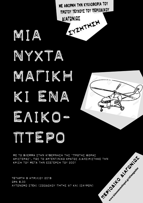 Με αφορμή την έκδοση του περιοδικού Διαγωνίως: Γραμμές πρακτικής θεωρίας στην προοπτική του κοινωνικού ανταγωνισμού σας καλούμε στην εκδήλωση: "Μια νύχτα μαγική κι ένα ελικόπτερο: με το βλέμμα στην κυβέρνηση της "πρώτης φοράς αριστερά", πώς το αργεντίνικο κράτος διαχειρίστηκε την κρίση του μετά την εξέγερση του 2001". Την Τετάρτη 6 Απριλίου στις 20:00 στο Αυτόνομο Στέκι (Ζ. Πηγής 97 & Ισαύρων)