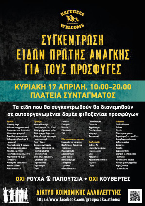 Την Κυριακή 17 Απριλίου, στην Πλατεία Συντάγματος, από τις 10:00 έως τις 20:00 συγκεντρώνουμε είδη άμεσης ανάγκης για τους πρόσφυγες.