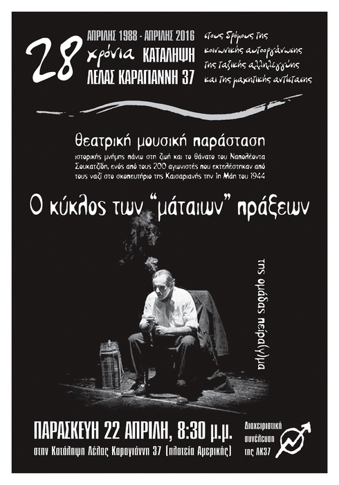 Μια θεατρική μουσική παράσταση ιστορικής μνήμης πάνω στη ζωή και τον θάνατο του Ναπολέοντα Σουκατζίδη, ενός από τους 200 αγωνιστές που εκτελέστηκαν από τους ναζί στο σκοπευτήριο της Καισαριανής