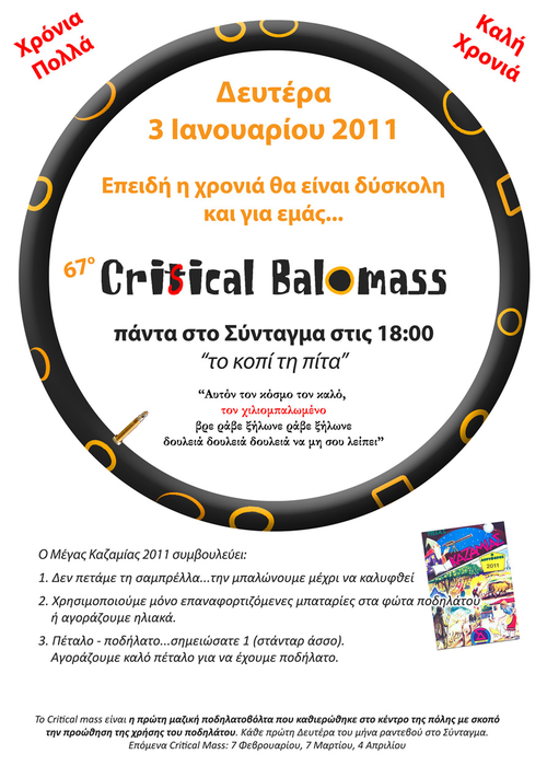 Η ιδέα του critical mass είναι μία μαζική βόλτα με ποδήλατα, ξεκινώντας από ένα προκαθορισμένο σημείο εκκίνησης κάθε μήνα, μια συγκεκριμένη μέρα. Σίγουρα ο σκοπός δεν είναι η ταχύτητα σε μια τέτοια βόλτα, αλλά κυρίως η προβολή του ποδηλάτου. Είναι μια γιορτή για το ποδήλατο στους δρόμους! Το CMR δεν προσπαθεί να εναντιωθεί στα αυτοκίνητα, τα λεωφορεία ή τα υπόλοιπα οχήματα που κινούνται, απλά παίρνει το μερίδιό του στο οδόστρωμα από όπου περνάει. Το critical mass ride είναι μια προσπάθεια διεκδίκησης του δικαιώματός μας να χρησιμοποιούμε το δρόμο, αλλά όχι η στέρησή του στους άλλους!