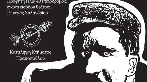 Κατάληψη Κτήματος Πραποπούλου Προφήτη Ηλία 49 απέναντι από την είσοδο του Θεάτρου Ρεματιάς Λεωφορείο 402: στάση "Γιασεμιών" Τρόλλευ: 18 και 19