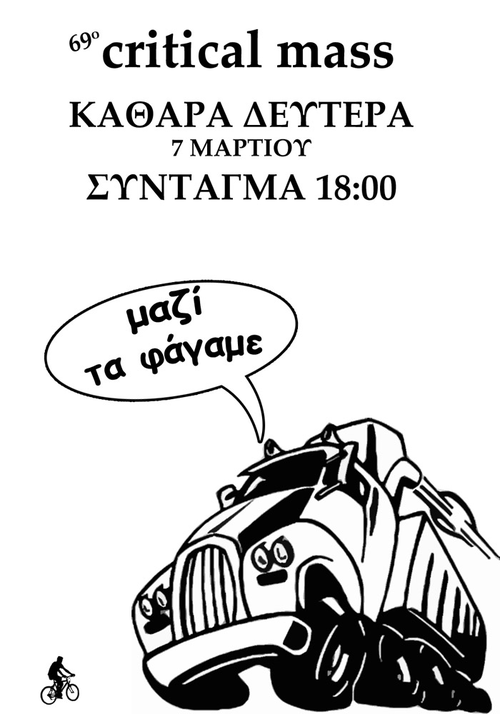Η ιδέα του critical mass είναι μία μαζική βόλτα με ποδήλατα, ξεκινώντας από ένα προκαθορισμένο σημείο εκκίνησης κάθε μήνα, μια συγκεκριμένη μέρα. Σίγουρα ο σκοπός δεν είναι η ταχύτητα σε μια τέτοια βόλτα, αλλά κυρίως η προβολή του ποδηλάτου. Είναι μια γιορτή για το ποδήλατο στους δρόμους! Το CMR δεν προσπαθεί να εναντιωθεί στα αυτοκίνητα, τα λεωφορεία ή τα υπόλοιπα οχήματα που κινούνται, απλά παίρνει το μερίδιό του στο οδόστρωμα από όπου περνάει. Το critical mass ride είναι μια προσπάθεια διεκδίκησης του δικαιώματός μας να χρησιμοποιούμε το δρόμο, αλλά όχι η στέρησή του στους άλλους!
