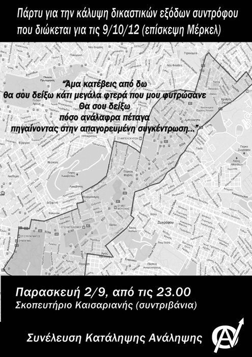 ΠΑΡΤΥ ΟΙΚΟΝΟΜΙΚΗΣ ΕΝΙΣΧΥΣΗΣ ΣΤΟ ΣΚΟΠΕΥΤΗΡΙΟ ΤΗΣ ΚΑΙΣΑΡΙΑΝΗΣ(ΣΥΝΤΡΙΒΑΝΙΑ) ΓΙΑ ΤΗΝ ΚΑΛΥΨΗ ΔΙΚΑΣΤΙΚΩΝ ΕΞΟΔΩΝ ΣΥΝΤΡΟΦΟΥ ΠΟΥ ΔΙΩΚΕΤΑΙ ΑΠΟ ΤΙΣ 9/10/2012(ΠΟΡΕΙΑ ΑΝΗΜΕΡΑ ΤΗΣ ΕΠΙΣΚΕΨΗΣ ΜΕΡΚΕΛ ΣΤΗΝ ΑΘΗΝΑ)