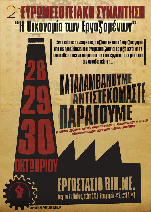 Με συμμετοχές από Βοσνία, Κροατία, Γαλλία, Ιταλία, Ελλάδα, Αργεντινή & Μεξικό, οι κατειλημμένες από τους εργαζόμενους επιχειρήσεις της Ευρώπης και της Μεσογείου, αυτοδιαχειριζόμεα εγχειρήματα και κολλεκτίβες εργασίας θα συζητήσουμε για το μέλλον της αυτοδιαχείρισης, τον αγώνα για τον κοινωνικό μετασχηματισμό και έναν κόσμο χωρίς αφεντικα!