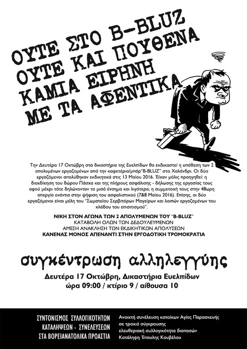 Συγκέντρωση αλληλεγγύης στα δικαστήρια της Ευελπίδων για την δικαίωση των 2 απολυμένων εργαζομένων του μαγαζιού "B-BLUZ" στο Χαλάνδρι [Δευτέρα 17 Οκτώβρη, ώρα 09:00, κτίριο 9, αίθουσα 10].