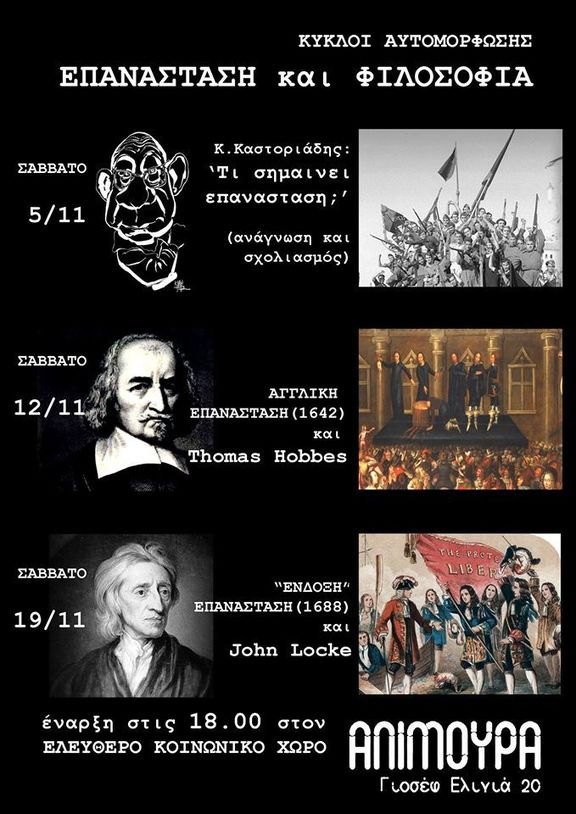 Με πυξίδα την αλληλεγγύη ας χτίσουμε σχέσεις αυθεντικές, ρηγματώνοντας βαθιά τον κόσμο της εξατομίκευσης, ορθώνοντας συνολικές και συλλογικές απαντήσεις. Σας καλούμε λοιπών όλους και όλες για να συγκροτήσουμε από κοινού την ανοιχτή ομάδα αυτομόρφωσης που στοχεύει να μελετήσει τις σχέσεις της επανάστασης με τη φιλοσοφία αλλά και για την επεξεργασία κάθε θέματος που μπορεί να απασχολεί οποιονδήποτε απο εμάς.