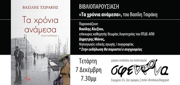 Η Σφεντόνα σας καλεί στη βιβλιοπαρουσίαση του νέου βιβλίου του Βασίλη Τσιράκη "Τα χρόνια ανάμεσα" με ομιλητές τους Βασίλη Αλεξίου και Δημήτρη Μάνο, την Τετάρτη 7/12 στις 19:30!