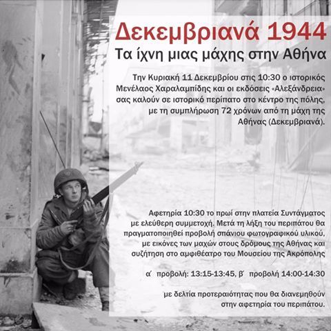 Την Κυριακή 11 Δεκεμβρίου, στις 10:30 το πρωί, ο ιστορικός Μενέλαος Χαραλαμπίδης και οι εκδόσεις «Αλεξάνδρεια», διοργανώνουν ιστορικό περίπατο με ελεύθερη συμμετοχή στο κέντρο της Αθήνας.