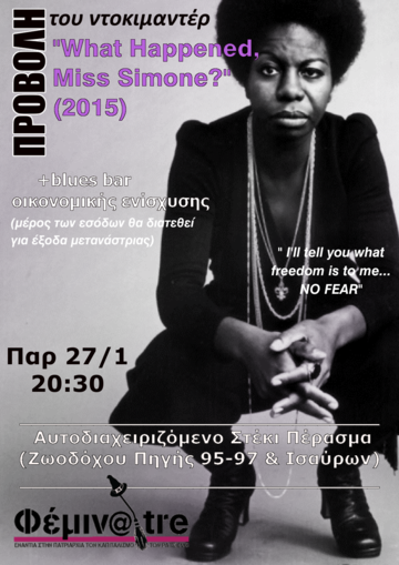 Την Παρασκευή 27/1, κατά τις 8.30, κατεβαίνουμε τα σκαλιά της Ζ.Πηγής & Ισαύρων για την προβολή του ντοκιμαντέρ "What Happened, Miss Simone?" (2015) της Liz Garbus που αφηγείται τη ζωή της θρυλικής φιγούρας της jazz, των blues και της soul, Nina Simone.