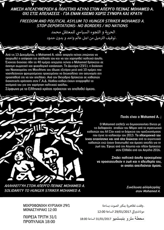 Από τις 13 του Δεκέμβρη, ο Mohamed κάνει απεργία πείνας ζητώντας να ακυρωθεί η απόφαση απέλασής του και να του χορηγηθεί πολιτικό άσυλο. Νοσηλεύεται στο Βοστάνειο Νοσοκομείο Μυτιλήνης σε άσχημη σωματική και ψυχολογική κατάσταση. Στις 13/1, οι μπάτσοι τον «καθησυχάζουν» για την υπόθεσή του και του ανακοινώνουν πως θα τον μεταφέρουν στην Αθήνα μέσα στις επόμενες μέρες· ο ίδιος συναινεί και «επιστρέφει προσωρινά» στη Γ.Α.Δ Λέσβου. Και κάπως έτσι μεθοδεύεται η απέλασή του, αφού αντί για την Αθήνα, του ανακοινώνεται πως την επομένη θα απελαθεί στην Τουρκία, με τις διαδικασίες που προβλέπονται από το σύμφωνο ΕΕ-Τουρκίας. Μετά από πιέσεις αλληλέγγυων και δικηγόρων μεταφέρεται ξανά στο νοσοκομείο, με αποτέλεσμα η απέλασή του να αναβληθεί, συνολικά όμως απελαύνονται 10 άτομα μία μέρα μετά. Τη Δευτέρα (23/1), η διοίκηση του Νοσοκομείου της Μυτιλήνης του έδωσε εξιτήριο προκειμένου να διευκολύνει την αστυνομία στη προσπάθειά της να τον απελάσει. Την Πέμπτη 26/1 εκδίδετε απορριπτική απόφαση από το πρωτοδικείου μυτιλήνης για την αντίρρηση κατά της κράτησης του Mohamed A.