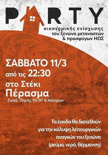 We invite you to our party on March 11, at 22.00h, at ''Steki Perasma'', Zoodochou Pigis 95-97 and Isavron, Exarheia.. All profits earned at the party will be used to cover the operational costs of the house (water, electricity, heating, etc.)''