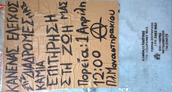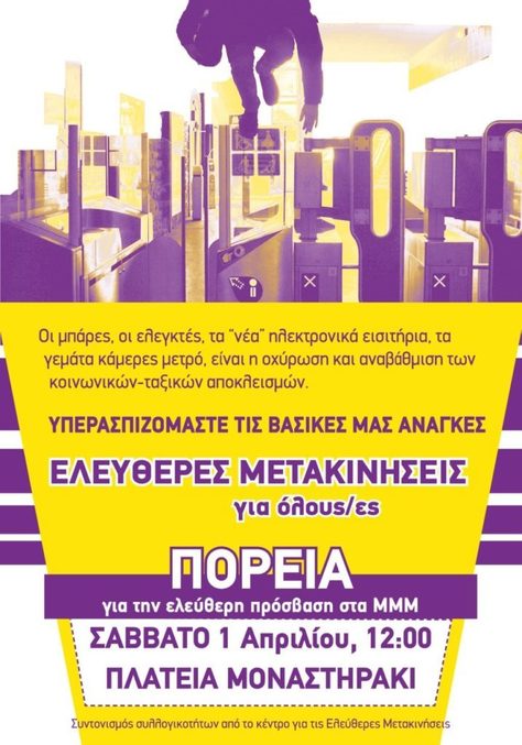 Το Σάββατο 1/4, στις 12μμ, στο Μοναστηράκι συμμετέχουμε στη συγκέντρωση-πορεία που καλεί ο "Συντονισμός συλλογικοτήτων από το κέντρο για τις Ελεύθερες Μετακινήσεις".