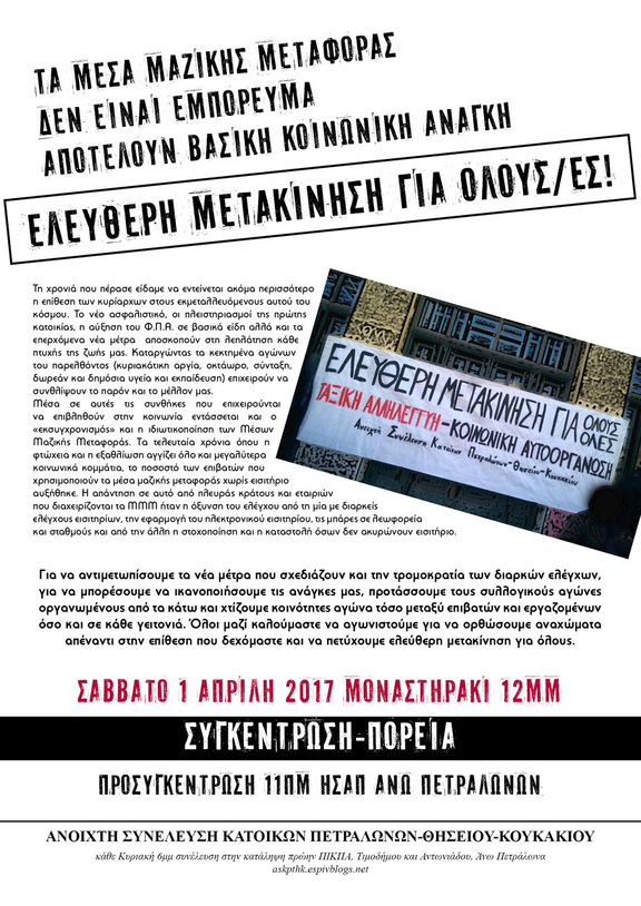 Στηρίζουμε την πορεία για την ελεύθερη μετακίνηση με τα ΜΜΜ, το Σαββάτο 1 Απριλίου 2017, 12μμ, Μοναστηράκι